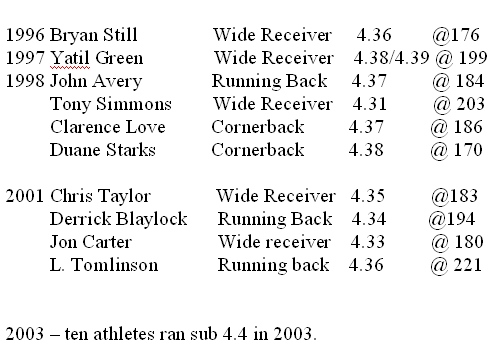 Then add 100 for acceleration. The 100 may be the best outdoor event to quantify speed. The 40 yard dash and the 100 meter dash are completely different races and while guys that are elite in one tend to be at least very good in the other attempting to correlate times doesnt particularly make sense.